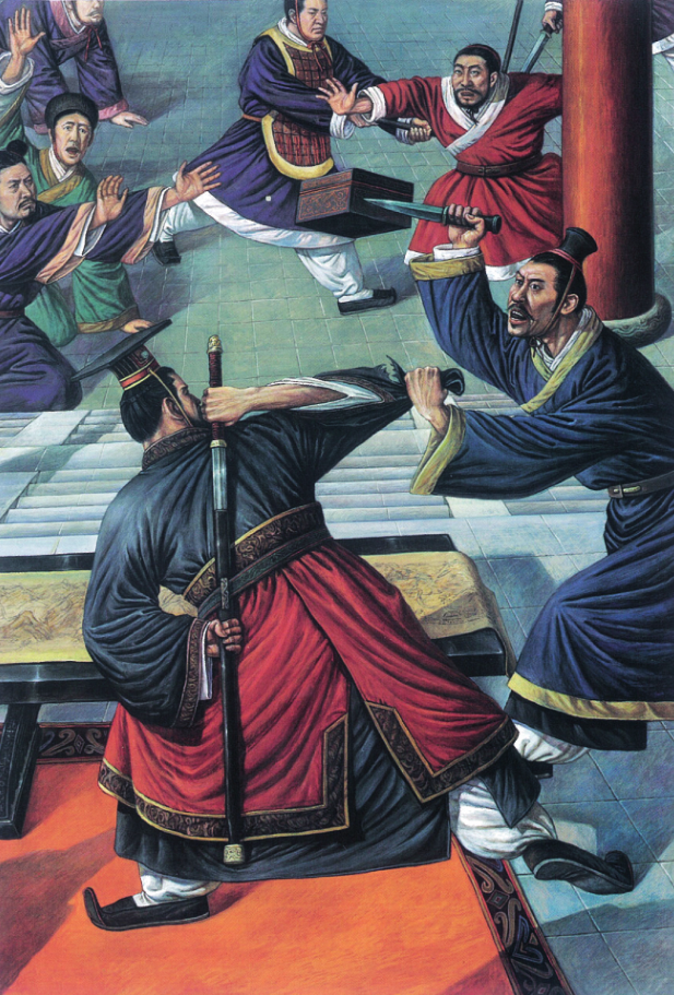 刺杀秦王时,《战国策》原文也是“因左手把秦王之袖而右手持匕首揕之”。“揕”字至关重要,有写作经验的人都知道,用文字营造画面感,靠的正是动词。如何理解这个字,将直接决定荆轲是否想第一时间取秦王性命。《广韵》 《集韵》等对这个字的解释都是:“拟击也。”也就是摆出要刺击的动作,但并不真的刺。此外,翻遍先秦两汉史料,“揕”除了在《史记》 《战国策》 《燕丹子》与荆轲相关的篇章,只在《管子·大匡》里出现过,正是曹刿劫持齐桓公(有观点认为曹刿、曹沫实为一人),他“左揕桓公,右自承”,后面的剧情明确显示,曹刿并不想真的杀死齐桓公。