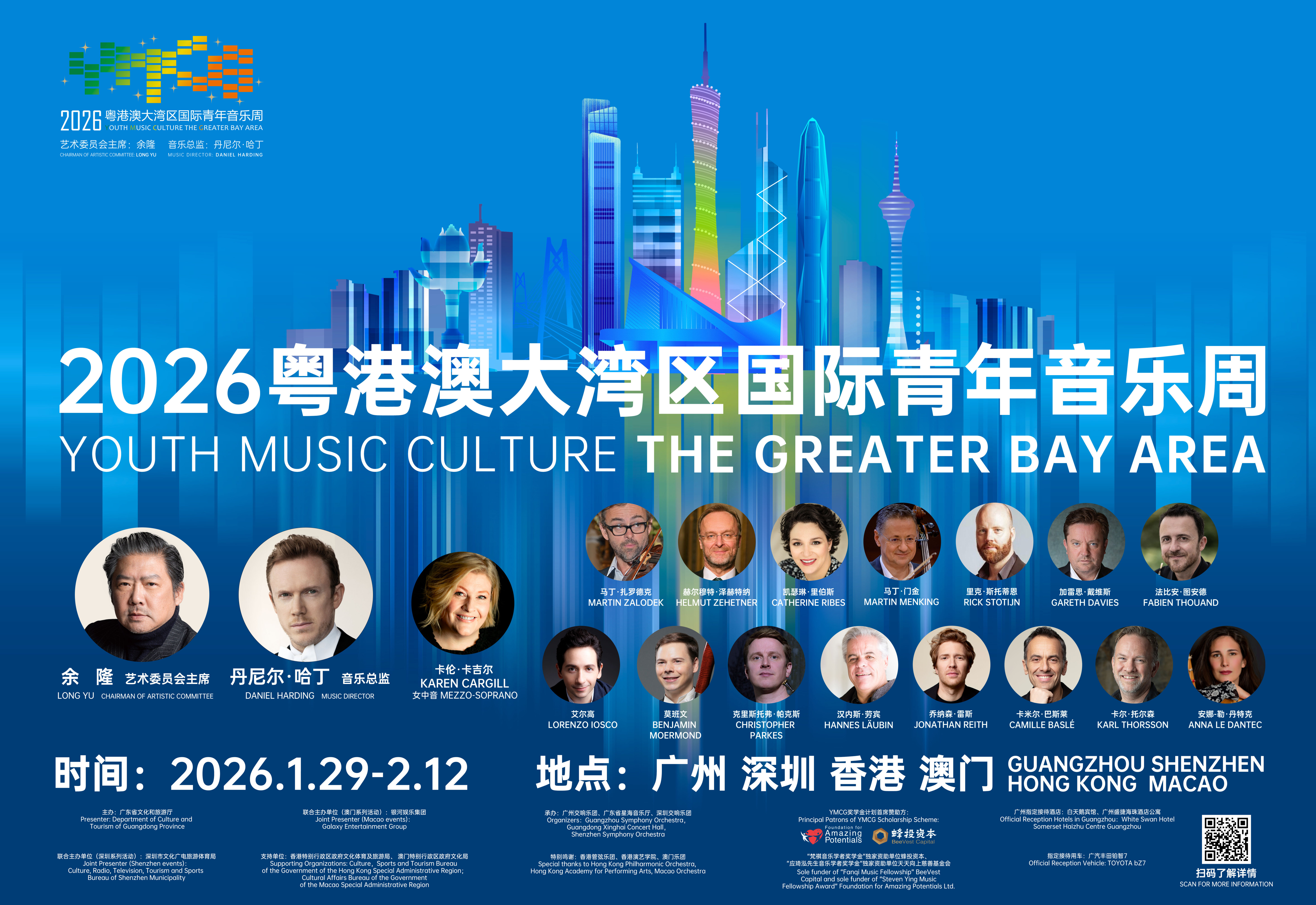 由国际指挥大师丹尼尔·哈丁领衔,17位来自柏林爱乐乐团、维也纳爱乐乐团等世界名团的首席演奏家受邀组成导师团队。同时,从全球78所专业院校及国内外21支职业乐团中遴选出的102位青年音乐家集结湾区,组成2026 YMCG管弦乐团,以及由广州交响乐团、深圳交响乐团、香港管弦乐团、澳门乐团音乐家组成的粤港澳大湾区节日乐团,将在湾区四大中心城市举行7场音乐会、10场大师班和5场“乐聚•畅谈”名家讲坛。