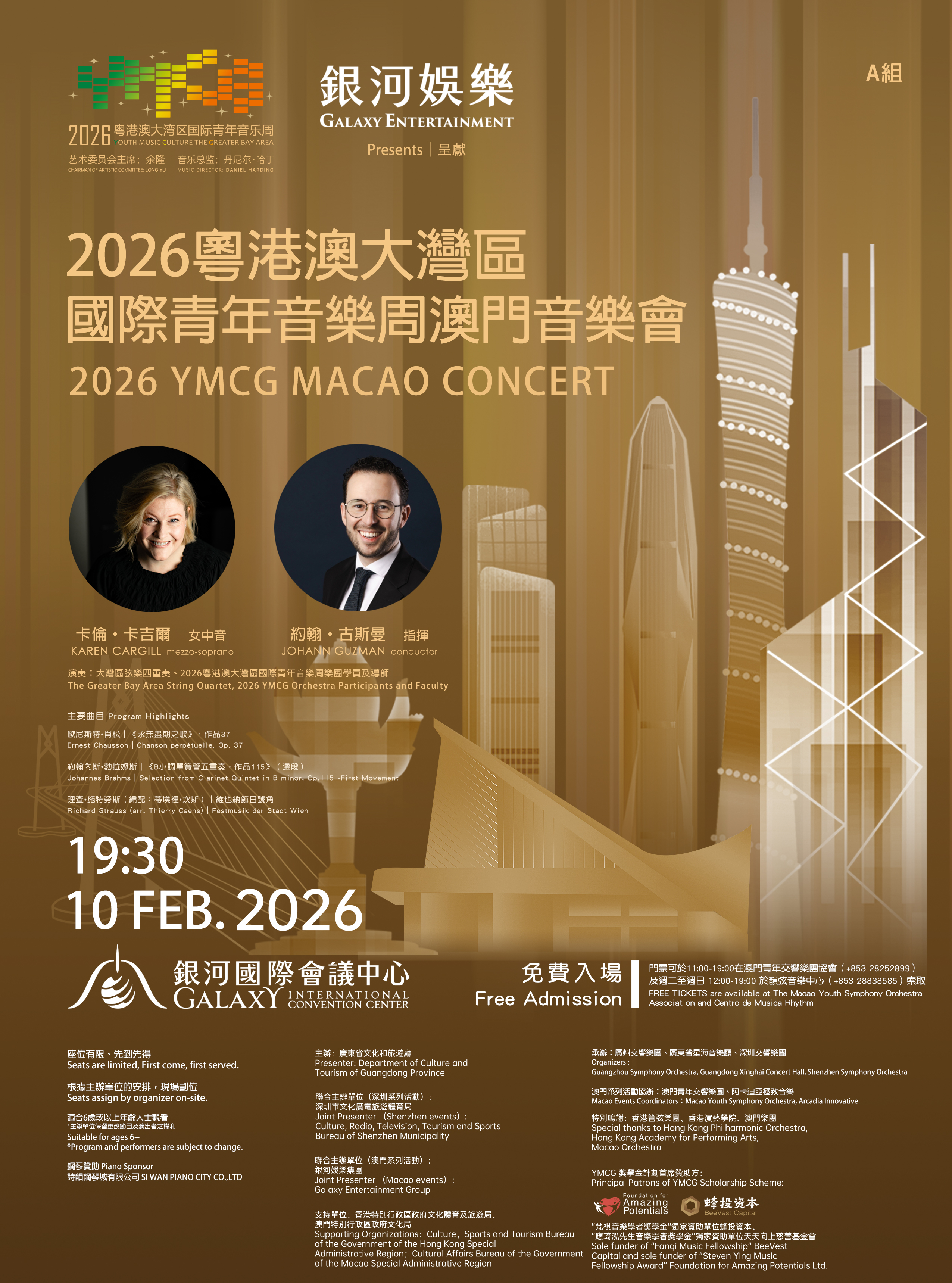 经过十年耕耘,继连续十年在广州、连续四年在深圳、连续三年在香港举办相关活动,音乐周在2026年首次进入澳门。在银河娱乐集团的大力支持下,本次澳门站系列活动的开展,使音乐周首次实现了在湾区四大中心城市的同频共振,体现出大湾区文化艺术高质量融合发展的澎湃动力,意义非凡。
