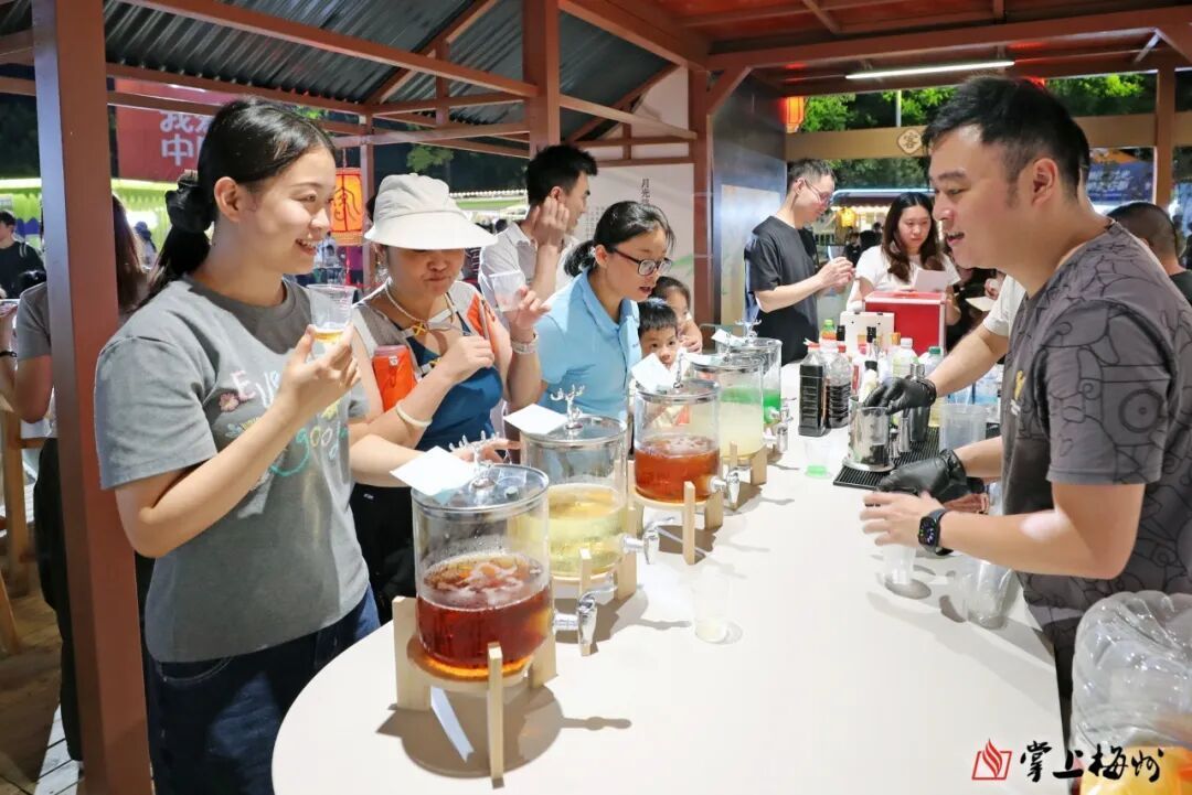 “麻烦给我调一杯米香鸡尾酒!”“没想到传统米香酒能这么调,喝起来有果香又有酒香”……10月2日晚,梅州城区院士广场“客来酒馆”互动场景区刚一开放,就被此起彼伏的热闹声包围。调酒师忙着递上调制饮品,游客们或举着酒杯拍照,或围坐在一起细细品尝,古色古香的场景里满是节日的烟火气。